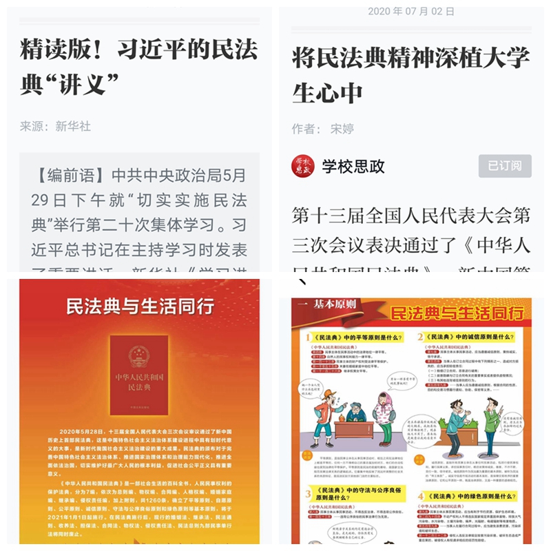 7月6日下午,按照校工会通知要求,公司分工会组织全院教职工学习宣传贯彻《中华人民共和国民法典》(以下简称“民法典”)。会前一周,学院分工会已将《中华人民共和国民法典》(草案)以及《习近平的民法典“讲义”》、《将民法典精神深植老员工心中》、九张挂图带你速览民法典(学习强国转载)等相关学习资料发送到学院教工微信群中,通过线上线下、自学和集中研讨等形式进一步提升全院教职工对于民法典的认知和了解。