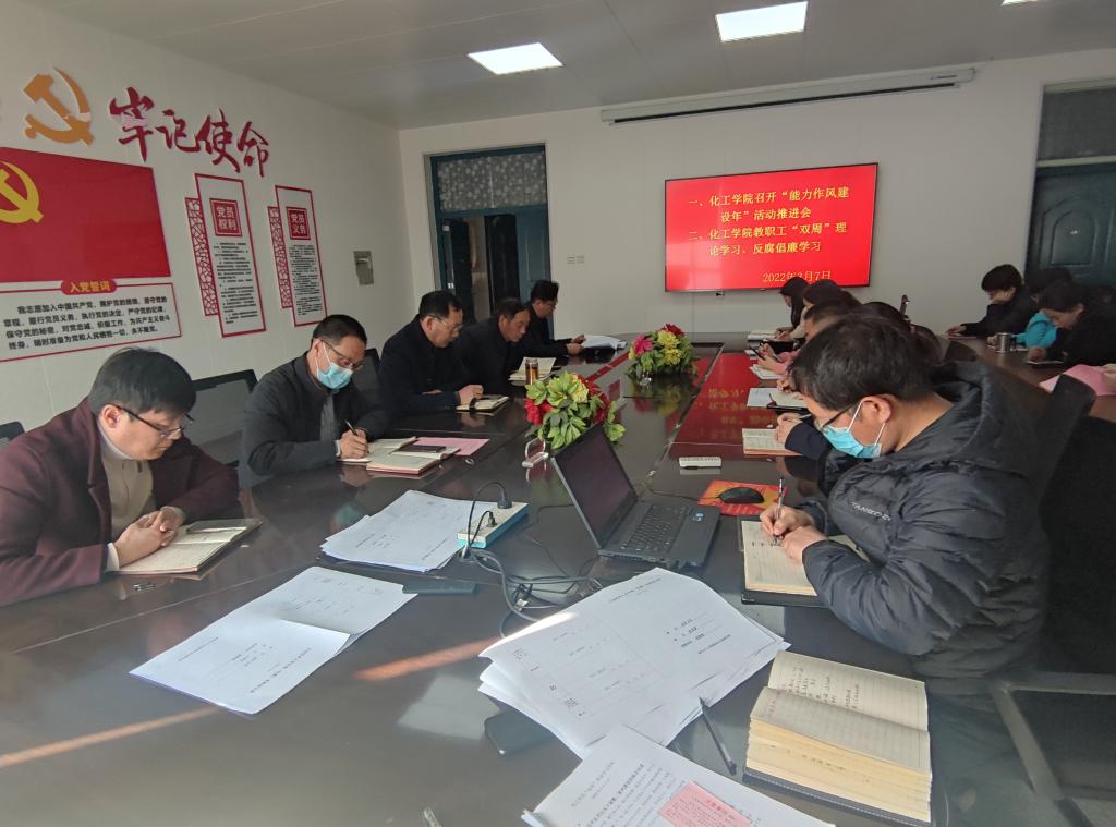 为深入贯彻落实习近平总书记关于能力作风建设的重要论述,推动学校“能力作风建设年”活动顺利开展,3月7日下午,化工公司在二教2510会议室召开“能力作风建设年”活动推进会暨2022年重点工作任务布置安排会。学院全体教职工参会,会议由院党总支副书记欧阳胜主持。