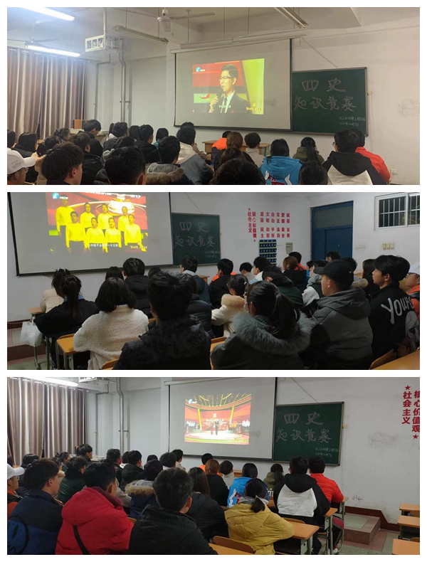 为深入学习贯彻习近平新时代中国特色社会主义思想和习近平总书记关于“四史”的重要论述,进一步提升公司党员干部理论素养和党性修养,按照公司党委组织部的要求,12月9日晚间19:30,公司党总支要求党员干部在家自学观看,院团总支积极组织员工干部和入党积极分子在601教室集中观看由河南广播电视台承办“铭记历史,走向复兴”---“四史”知识竞赛现场直播。