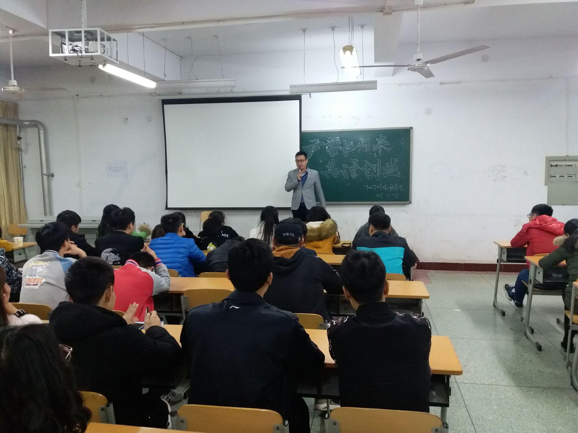 2017年11月23日,betway西汉姆联优秀毕业生尹建坡学长重归母校,在崇学楼2601教室与betway西汉姆联2016级员工共话创业与就业。